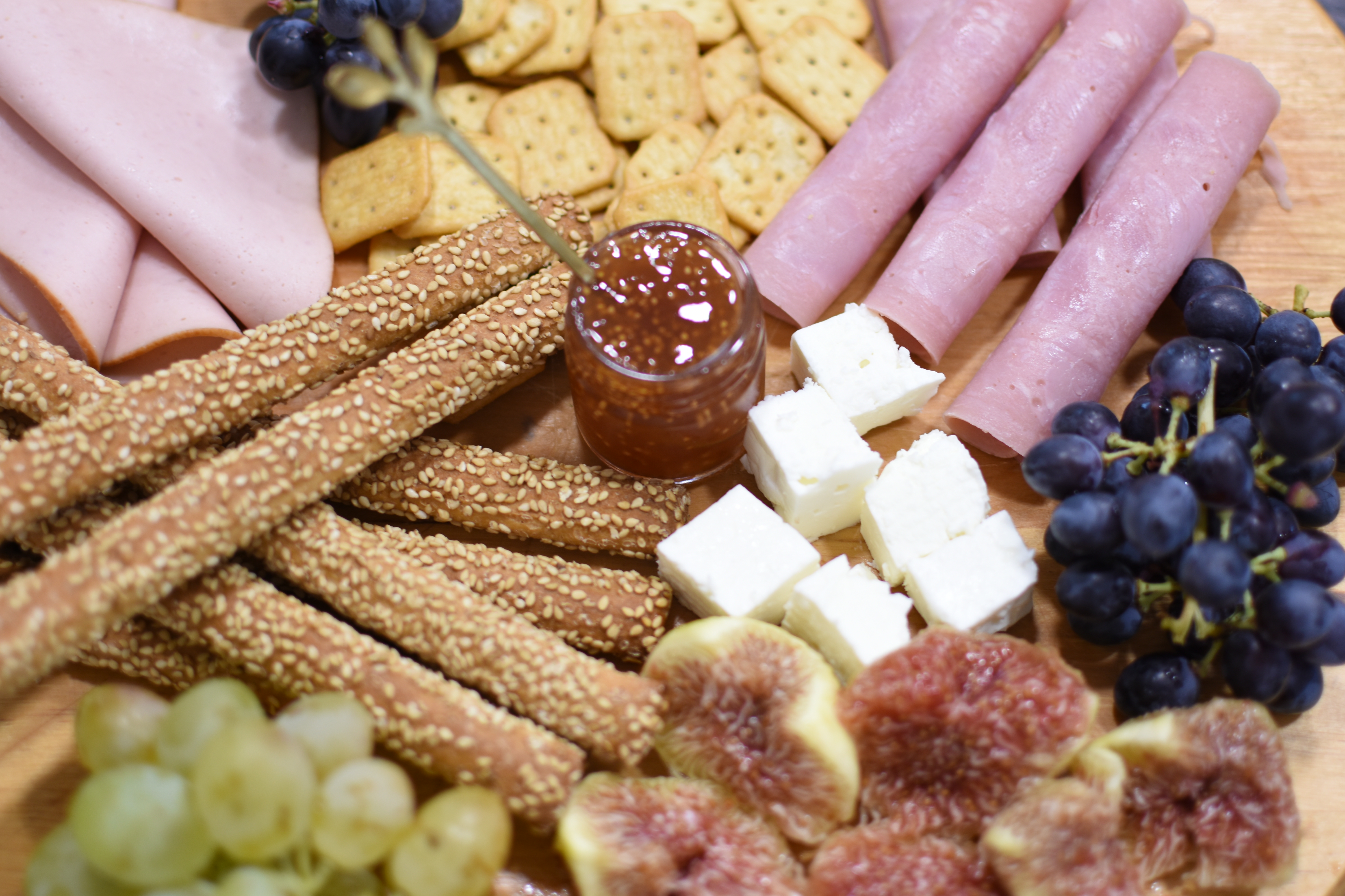 Τοποθετούμε ανά σημεία τις διαφορετικές ομάδες των υλικών ώστε να υπάρχει χρωματική και γευστική ποικιλία στο πλατό μας. Τοποθετούμε ξύλινα στίκς (πχ οδοντογλυφίδες) πάνω σε κάποια από τα υλικά όπως στα τυριά, στα φρούτα και στα αλλαντικά ώστε να διευκολύνουμε την πρόσβαση χωρίς να λερώνουμε τα χέρια μας. Προσθέτουμε τη μαρμελάδα σύκο και το πικάντικο chutney πορτοκάλι από τη charismama ανάμεσα στα υπόλοιπα υλικά προκειμένου να βουτάμε τα κριτσίνια και τα τυριά μας και να απογειώνουμε τη γεύση μας όσο απολαμβάνουμε το κρασί μας.